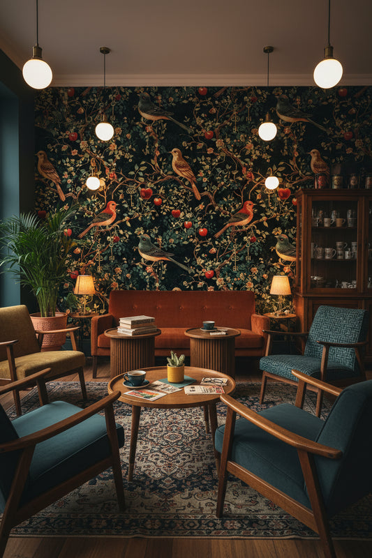 Jungle wallpaper features layered tropical foliage, exotic birds, and rainforest textures. Styles...