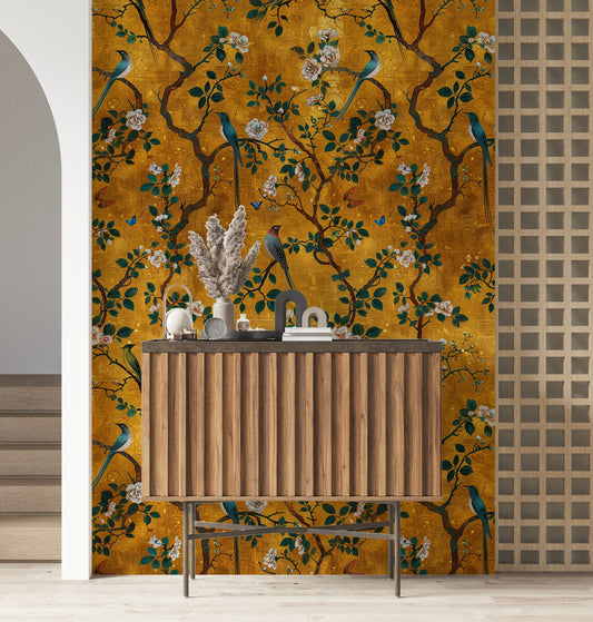 Chinoiserie wallpaper combines delicate florals, climbing branches, and detailed bird motifs to...