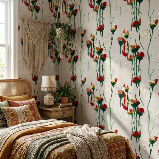 White Background Wallpaper Red Floral Decor