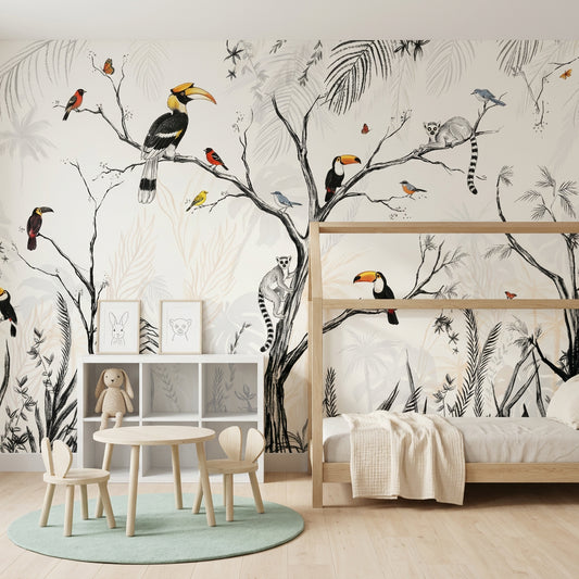 Bohemian Style Wall Murals look most natural next to light oak or walnut, cane/rattan (a cane headboard or rattan sideboard), and aged brass or matte black hardware. For textiles, use a chunky cream knit throw, a tan leather pouf, and linen curtains in warm white; then add one patterned rug like a faded terracotta-and-indigo kilim to echo the mural without repeating it exactly. These pairings work especially well with boho wall mural designs that feature desert tones, botanical sketches, or bohemian birds wall mural artwork.