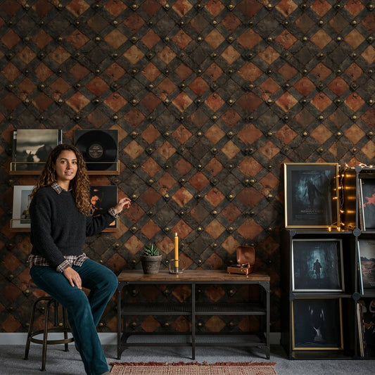 Under warm evening lamps, Brown Wallpaper shows more depth than photos can catch: cocoa grounds pick up a red-clay glow, walnut lines look softer, and small-...