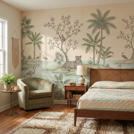 In the bedroom, opt for white bedding with soft blush accent pillows. A wooden bed frame in a natural finish will create a cohesive look with the mural's earthy vibe. Consider adding a light gray throw blanket to tie everything together.