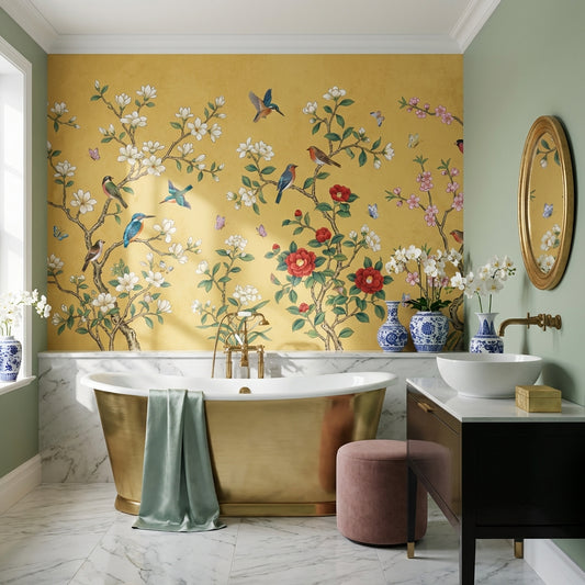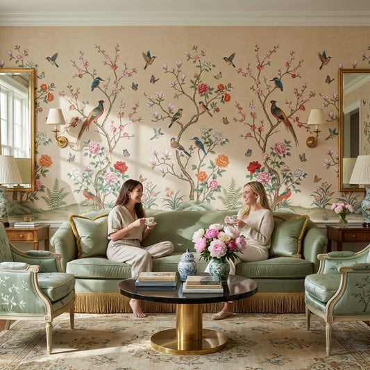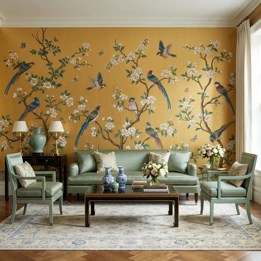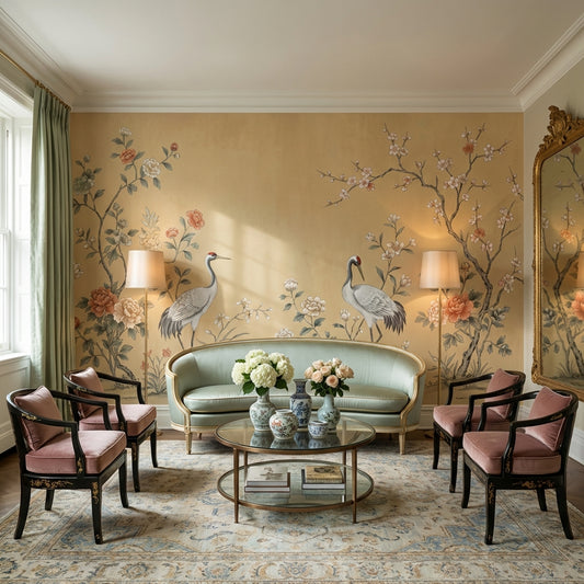 When styling your living room with a Cherry Blossom mural, think about pairing it with a light oak coffee table and soft beige upholstery. A few brass accent lights will add warmth and sophistication, beautifully echoing the gold tones found in the floral design.