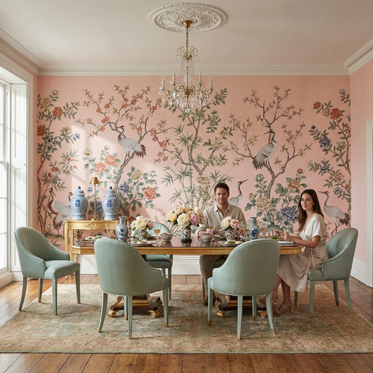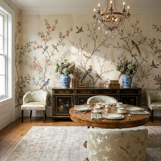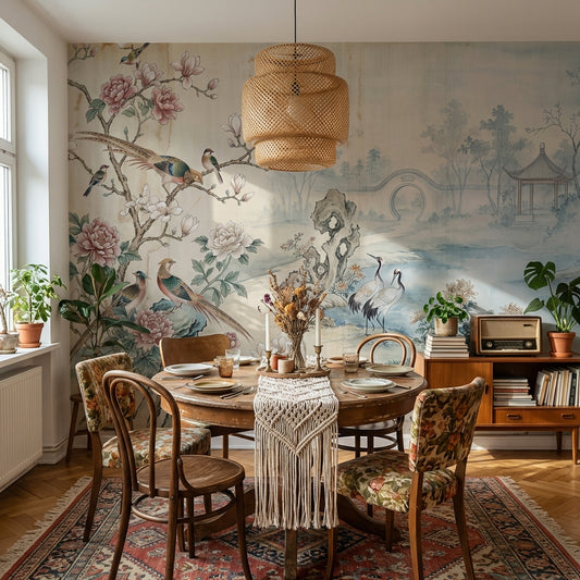 In your dining area, a dark walnut table paired with white dining chairs will create a striking contrast against the pastel mural. Add a few small floral centerpieces to draw the eye and enhance the theme of nature.