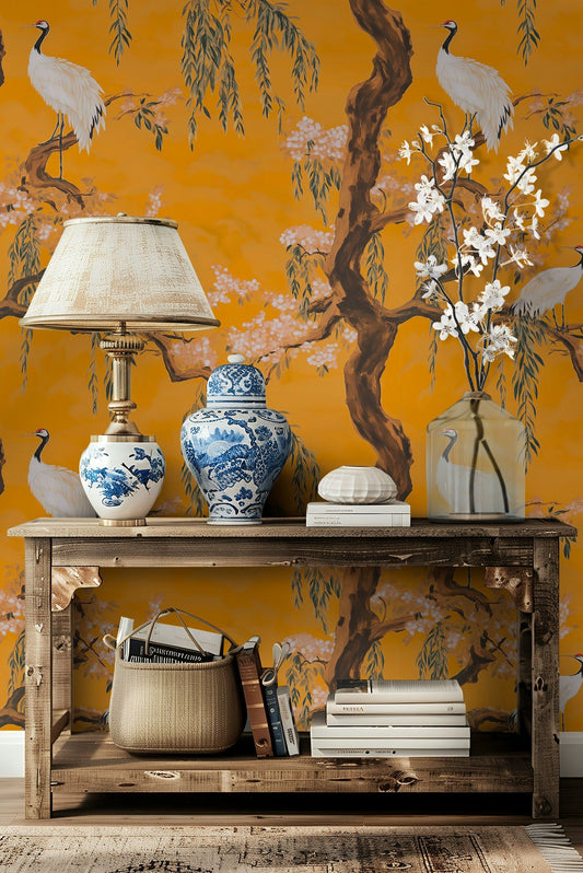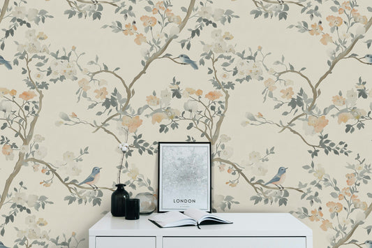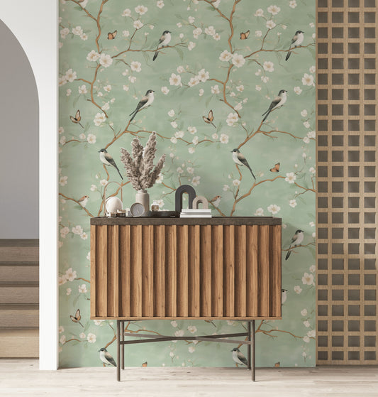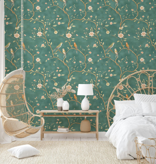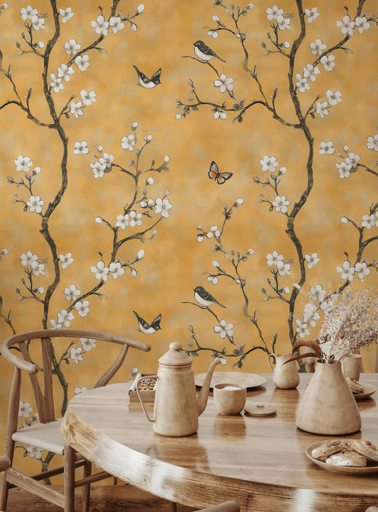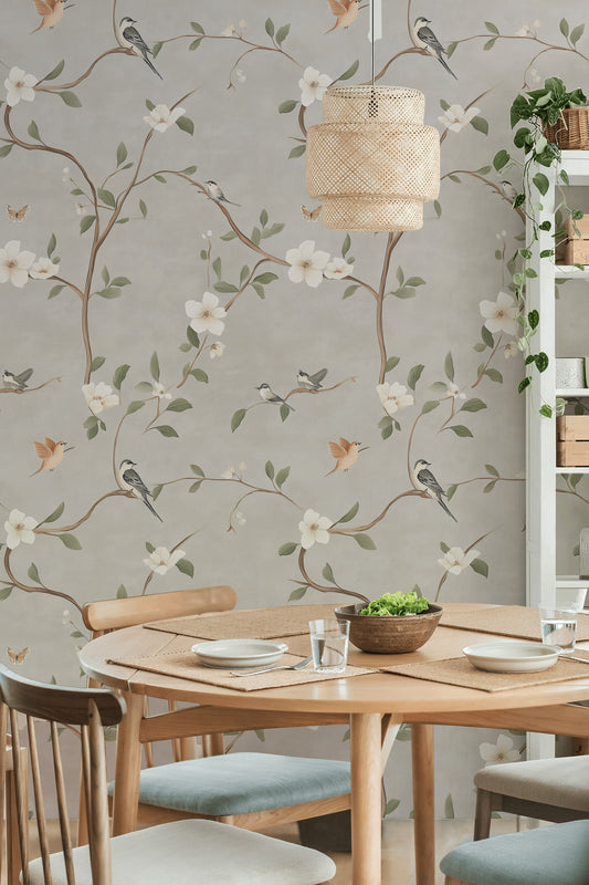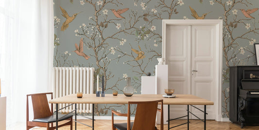 Chinoiserie wallpaper combines delicate florals, climbing branches, and detailed bird motifs to create timeless wall murals. Inspired by classic oriental artistry, these designs use layered colors and fine linework to bring depth and movement across large surfaces. Ideal for statement walls, dining rooms, or bedrooms, chinoiserie wallpaper blends traditional elegance with a modern decorative finish.