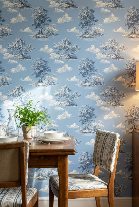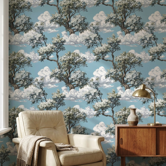 For your living room, I suggest pairing the Cloud Wallpaper with a light oak coffee table and brass light fixtures. In the kids' bedroom, complement the wallpaper with white furniture and colorful accessories for a playful touch. In the home office, opt for a sleek black desk and a comfortable, ergonomic chair that contrasts nicely with the softer tones of the wallpaper. In the dining room, a dark wooden table mixed with clear glass vases filled with fresh flowers can create an engaging look that feels lively yet calm.