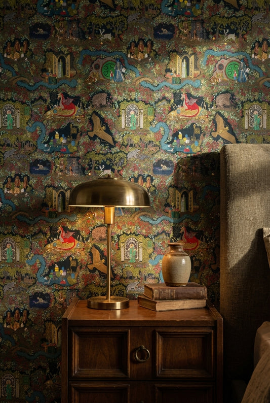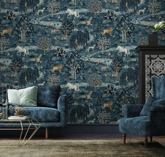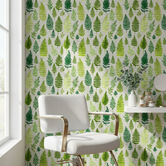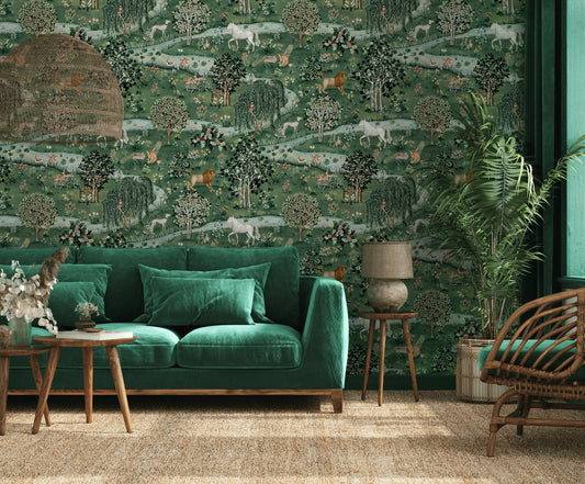 Styling your space with Forest wallpaper is all about balance and harmony. In your living room, pair forest-themed wallpaper with a dark leather sofa and brass light fixtures to highlight the organic elements while keeping a chic vibe. In your home office, consider a sleek, minimalist desk made of reclaimed wood with simple metal accents to keep the focus on the vibrant wallpaper behind it. In the dining area, an artisanal wood table complemented by handwoven chairs with soft cushions can enhance the immersive feel of the forest design. For the nursery, think about a soft beige rocking chair with a pastel throw blanket, which can beautifully contrast with the lush wallpaper.