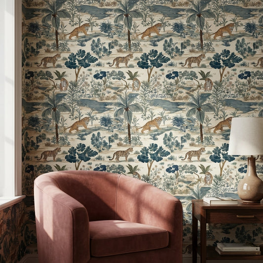 When using Jungle Animals Wallpaper, earthy tones like greens, browns, and warm neutrals work well with the vibrant designs. Consider adding furniture in light wood or white finishes to balance out the richer colors in the wallpaper.