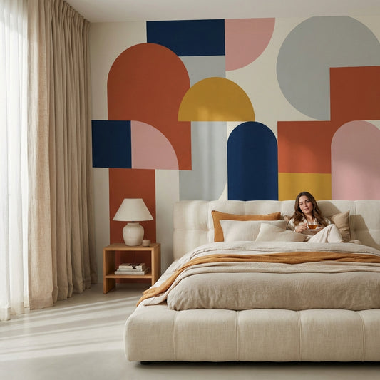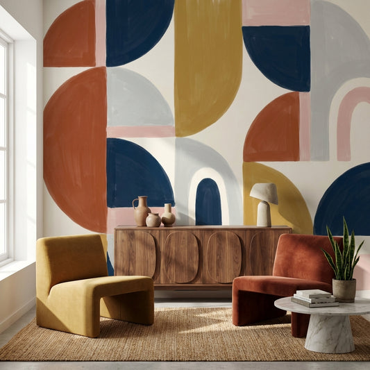 Under warm evening light, Multicolor Wall Murals pick up more depth than photos usually show: terracotta notes look earthier, inky blue sections recede slightly, and muted ochre details start to read like brushed pigment rather than flat print. From across the room, the scale of Multicolor Wall Murals feels more architectural than busy, which is why they hold a full feature wall without breaking up the room visually. In spaces where you want that same graphic presence near a desk zone, our Home Office Wall Murals collection shows how wall murals can frame shelving, task lighting, and streamlined storage with a similar sense of structure.