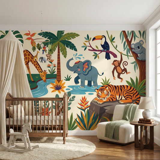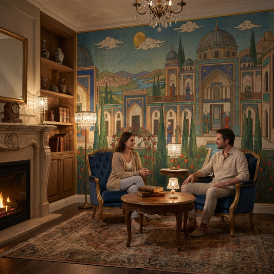Multicolor Wall Murals pair well with light oak or walnut furniture because natural grain calms down complex color, especially on wall murals peel and stick with busier patterns. For upholstery, choose bouclé in ivory, linen in sand, or velvet in a single pulled-from-the-mural tone like deep teal or rust to avoid competing colors. Add one grounding piece—like a matte black media console or a smoked-glass coffee table—to give the wall and murals a clear visual anchor.