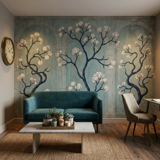 Navy Blue Wall Murals stand apart because the color is rarely a single flat navy; we see slate, smoke, indigo, and green-black undertones depending on the design, from navy blue smoke watercolor wall mural effects to blue mountain wall murals with misty layered edges. These wall murals navy blue styles pair especially well with a walnut media console, a camel leather armchair, and off-white linen drapery, while blue large floral wall murals sit well behind a black spindle bed with crisp white bedding. If you want the same depth in a repeat pattern, see Navy Blue Wallpaper. For more room-specific ideas, our guide to Blue Wallpaper For Living Room covers blue interior wall murals and furniture combinations that keep dark blue walls feeling balanced.