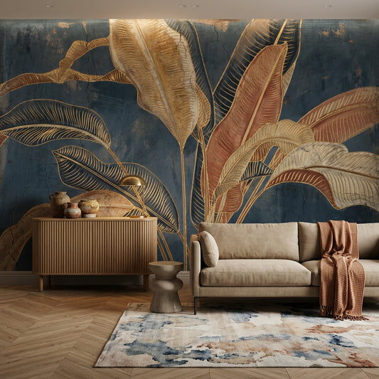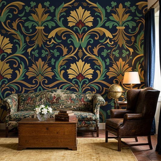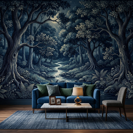 Try a walnut credenza, a white oak bed frame, or a matte black metal shelving unit—these finishes hold their own against a navy blue wall mural without competing. For textiles, add an ivory bouclé chair, rust linen pillows, or a camel leather bench to keep the palette grounded. Brass picture lights and an aged-brass mirror frame are especially strong with navy wall murals.