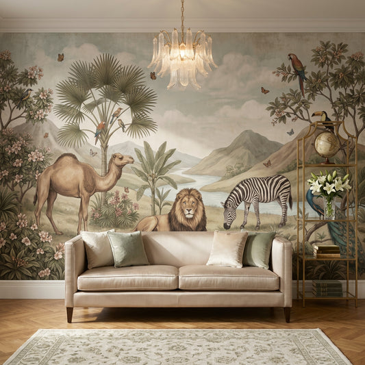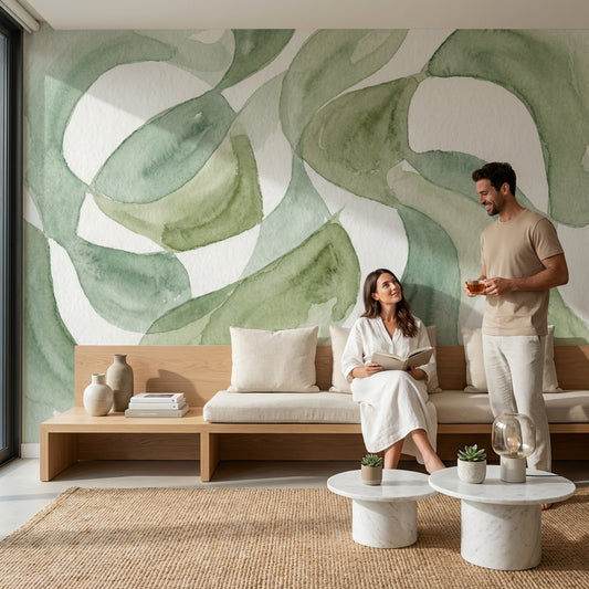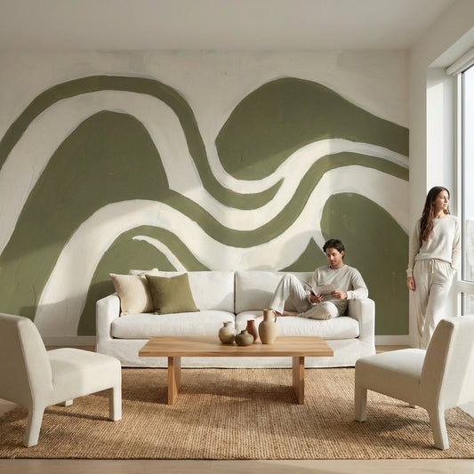 Olive Green Wall Murals stand apart from brighter green wall murals because the color usually carries moss undertones, a khaki cast, and a faint smoky gray layer that changes through the day. In rooms with north light, Olive Green Wall Murals read closer to dark green wall murals and look especially grounded with a camel leather armchair, an ecru boucle sofa, and a blackened steel coffee table. Patterns with washed plaster effects, oversized botanicals, or brushed textile textures give Olive Green Wall Murals a more architectural surface than flat paint, and if you want the same palette in repeat pattern form, see Olive Green Wallpaper. For layout ideas around sectionals, media units, and low oak shelving, our Green Wallpaper For Living Room guide covers the most suitable green placements.