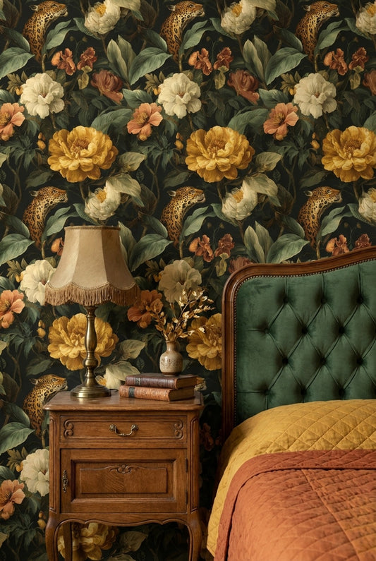 With Peony Wallpaper in blush or cream, use light oak nightstands, a cane-back chair, and linen bedding in oatmeal; add antique brass picture lights to echo the warm undertones. For moody peonies (navy, forest, or charcoal backgrounds), pair walnut furniture, a green velvet bench, and a Persian-style rug with burgundy accents to pick up the flower centers. If you’re using peel and stick wallpaper, repeat the look with removable details like a brass rail shelf and a boucle stool so the whole scheme can shift without a full refit.