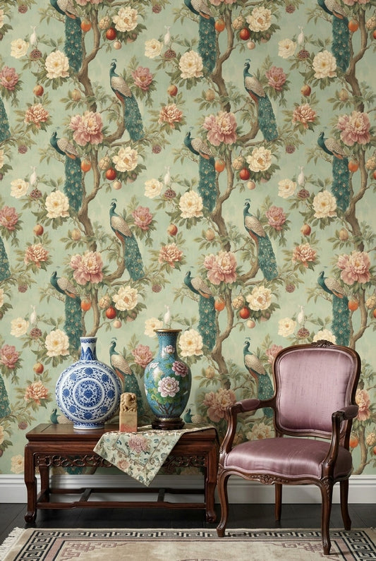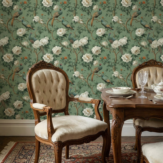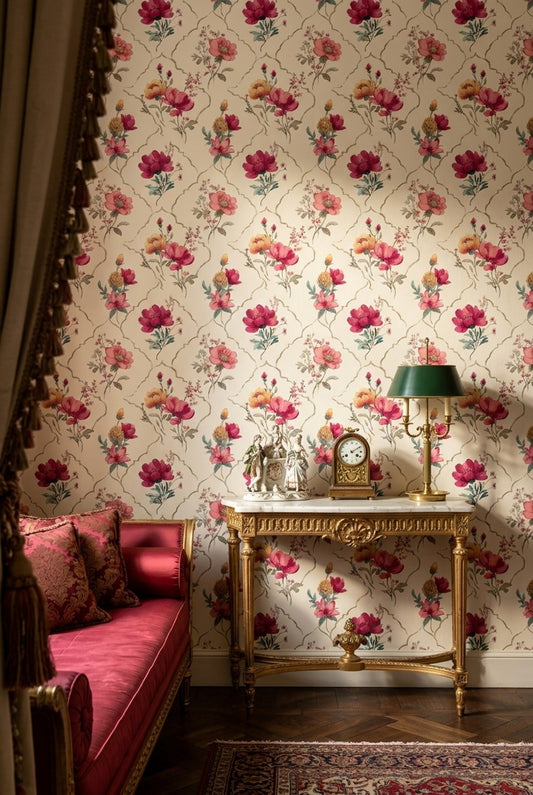 Peony Wallpaper pairs well with modern organic (oak, linen, off-white plaster tones) and with classic vintage (antique brass, scalloped mirrors, skirted furniture) because peonies already reference garden and heritage motifs. It also works in a clean contemporary space when the print is line-drawn or watercolor and the palette stays restrained—try black-ink peonies on ivory with matte black hardware. It tends to clash with very busy geometric patterns in high-contrast colorways; if you want pattern-mixing, choose a narrow pinstripe or small gingham in a matching blush or sage.