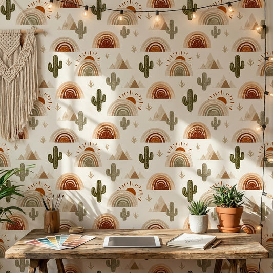 Current Rainbow Wallpaper leans into muted “desert rainbow” tones—clay, blush, butter, and sage—so it reads like a modern graphic rather than a cartoon. Designers also use oversized arches and lots of negative space, which fits today’s preference for simpler shapes and calmer rooms. If you want it to feel more grown-up, choose prints with thin linework rainbows and pair them with minimal black frames and a single solid-color throw. This is one reason rainbow is showing up alongside wallpaper murals in contemporary kids’ spaces.