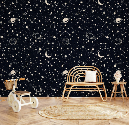 Space wallpaper features vast cosmic scenes with planets, stars, and nebulae, while galaxy wallpaper highlights swirling color gradients and deep space tones. Astronaut wallpaper adds playful exploration themes, and space themed wallpaper extends to murals like galaxy wall mural and space mural designs. From stars wallpaper to van gogh starry night wallpaper, these cosmic patterns bring an expansive universe into bedrooms, playrooms, or creative spaces.