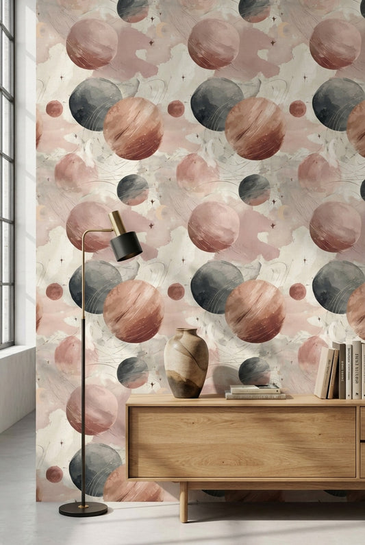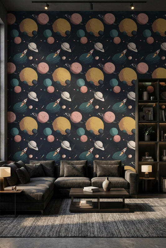When selecting furniture to pair with your space-themed wallpaper, consider a light oak table with brass accents. The warmth of the oak contrasts beautifully with cosmic designs while the brass adds a hint of sophistication. For a seating arrangement, plush gray sofas can complement the color scheme, while adding colorful throw pillows that reflect the colors in your wallpaper can tie the room together seamlessly. A glass coffee table can also provide an airy feel and allow the wallpaper's patterns to take center stage without overwhelming the space.