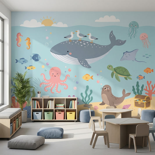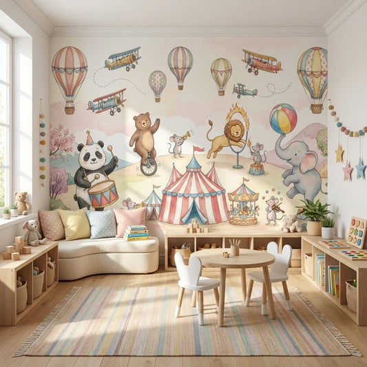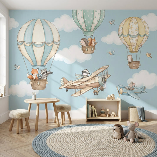 When styling with Wall Murals, consider the furniture and decor you'll pair them with. In the living room with the forest mural, opt for a plush grey sectional and rich wooden coffee tables that echo the natural theme. In the dining room, place sleek metal chairs around the oak table for a balanced industrial look with the city skyline mural. The children’s bedroom with animal characters can be paired with bright bedding and playful rugs to continue the fun theme. Lastly, the home office's world map can be complemented with a dark wood desk and vintage-style globes or travel books to create a cohesive environment.