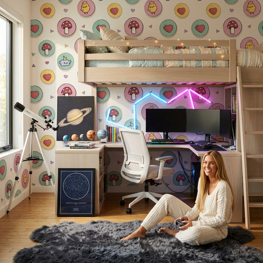 In a home office, Yellow Wallpaper belongs on the wall behind the desk, where daylight can pick up its warmth without competing with screens, and a pale ash desk, tan task chair, and black library sconces keep the scheme precise. For clients comparing layouts, our Home Office Wallpaper collection shows how lively wallpaper and wallpaper peel and stick options can frame shelving alcoves or the wall opposite the door. If you are planning a media wall or reading corner beyond the office, Statement Wallpaper For Living Room gives more placement ideas, and Muralls offers custom sizes, paste-the-wall install, and ships worldwide for Yellow Wallpaper sized to your exact wall.