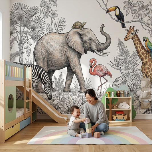 When styling around Zebra wall murals, think about how your furniture will interact with the bold design. Pair a Zebra mural with a sleek, white leather sofa and round glass coffee table for a contemporary feel. In a rustic setting, consider combining it with reclaimed wood furniture, like a farmhouse dining table paired with brass pendant lights, to warm up the starkness of the stripes. For a child's room, a playful quilt with colorful patterns can contrast beautifully with the monochromatic wall and offer a youthful touch.