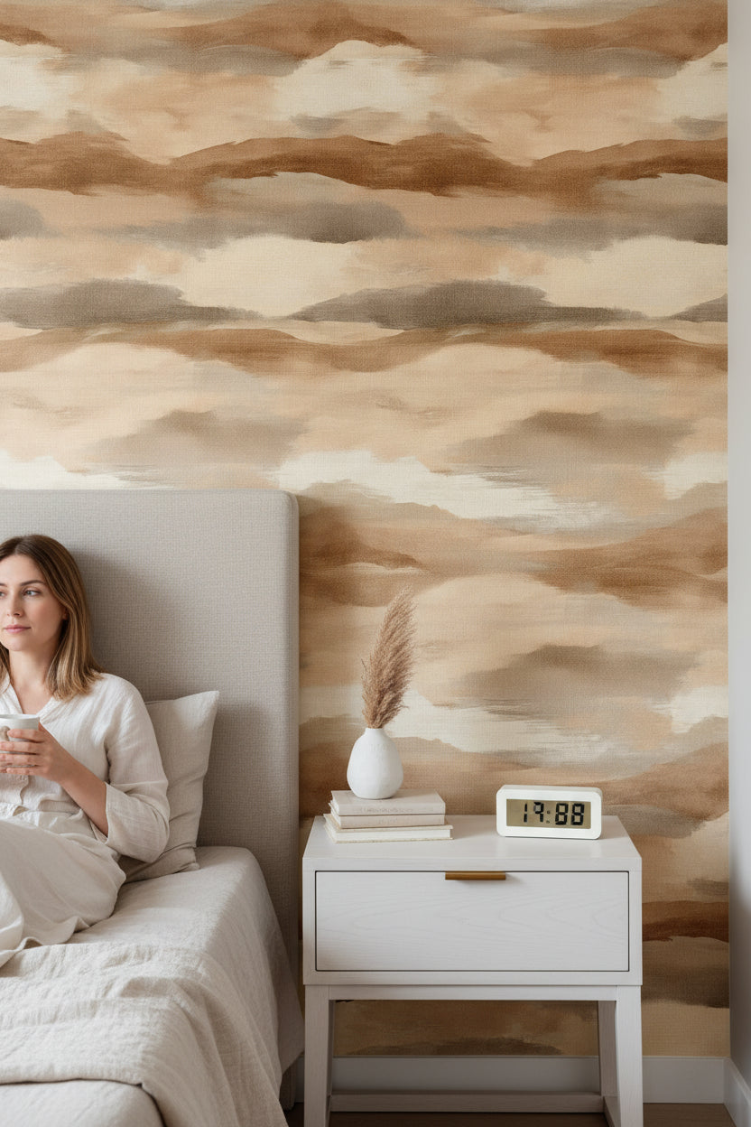 This abstract wall mural shows soft, earthy tones in brown, beige, and white. The design includes cloud-like shapes and mountain outlines, offering a minimalist and modern aesthetic.