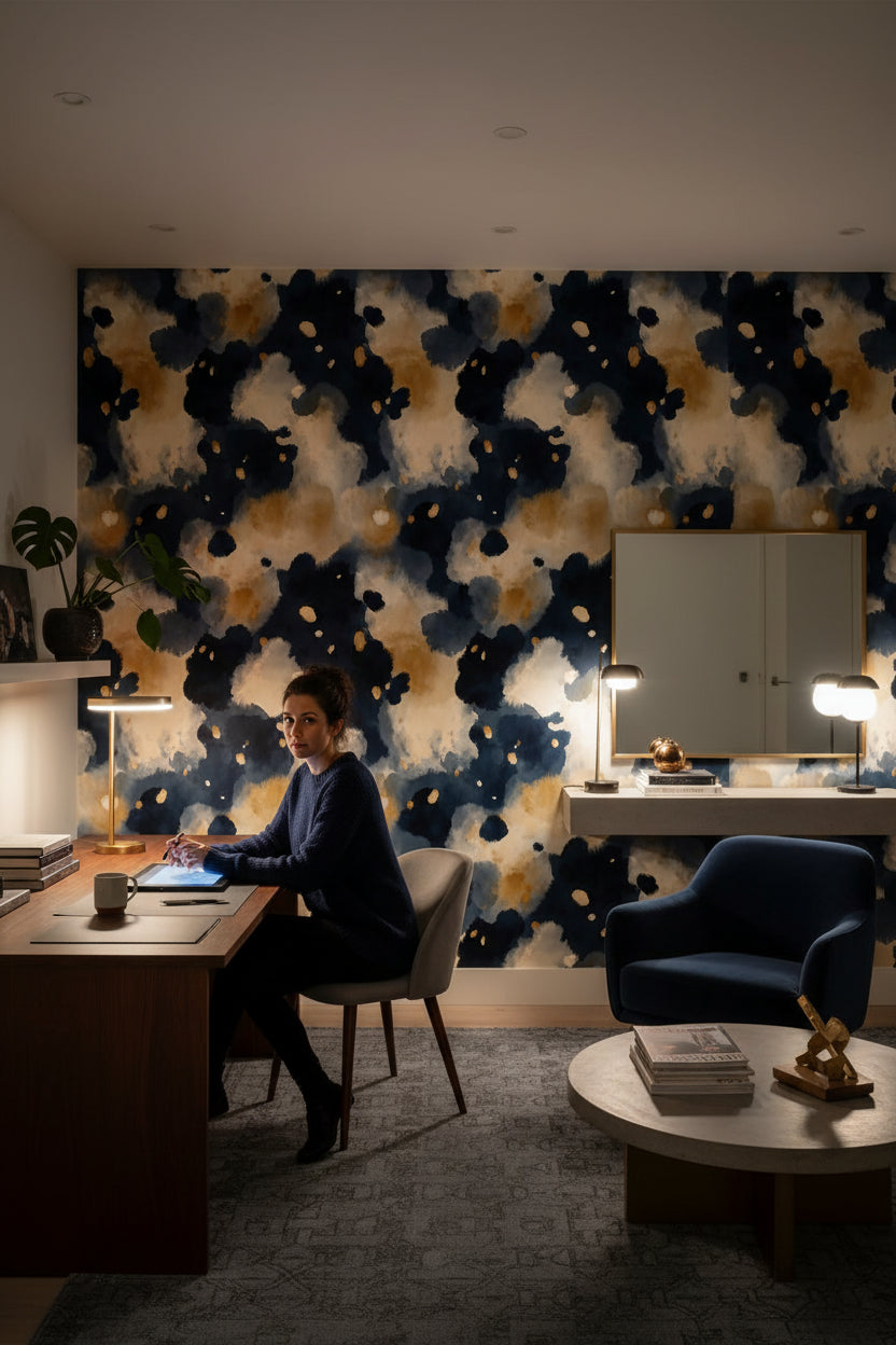Rich navy and gold tones swirl in bold abstract brushstrokes across the wall, creating a dynamic visual texture. This design's unique, fluid brush patterns bring a sense of movement and depth to the space, setting it apart from typical geometric or floral wallpapers.