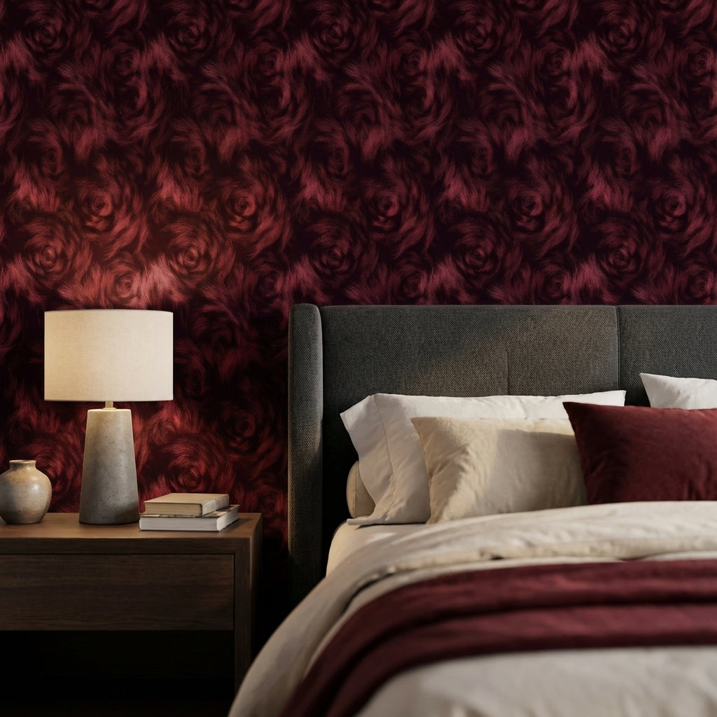 This abstract pattern wallpaper features a rich burgundy and black color palette, adding an elegant touch to any room. The textured design includes intricate patterns that enhance its sophisticated appeal.