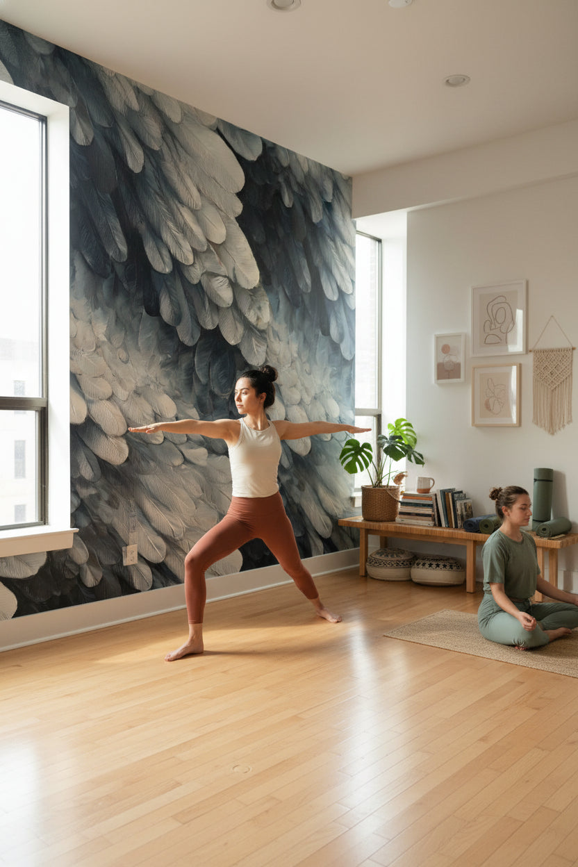 This abstract pattern wallpaper includes soft gray and blue feathers, creating a peaceful scene. The design features a blend of gray, white, and blue tones, perfect for adding a serene touch to any room.