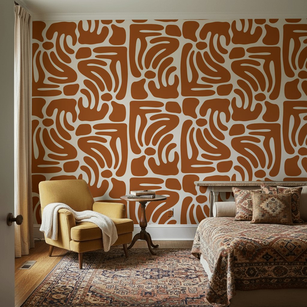 This abstract wallpaper features organic shapes with curved patterns in shades of brown and cream. The playful design works beautifully as a decorative mural for modern spaces.