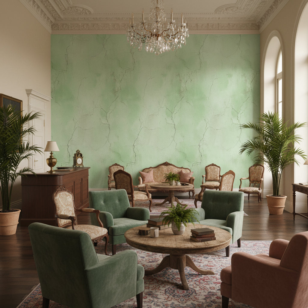 This wallpaper shows a rustic abstract pattern in tones of light green, cream, and brown. The vintage style adds a unique touch to any space. The design includes cracked patterns that enhance its rustic charm.