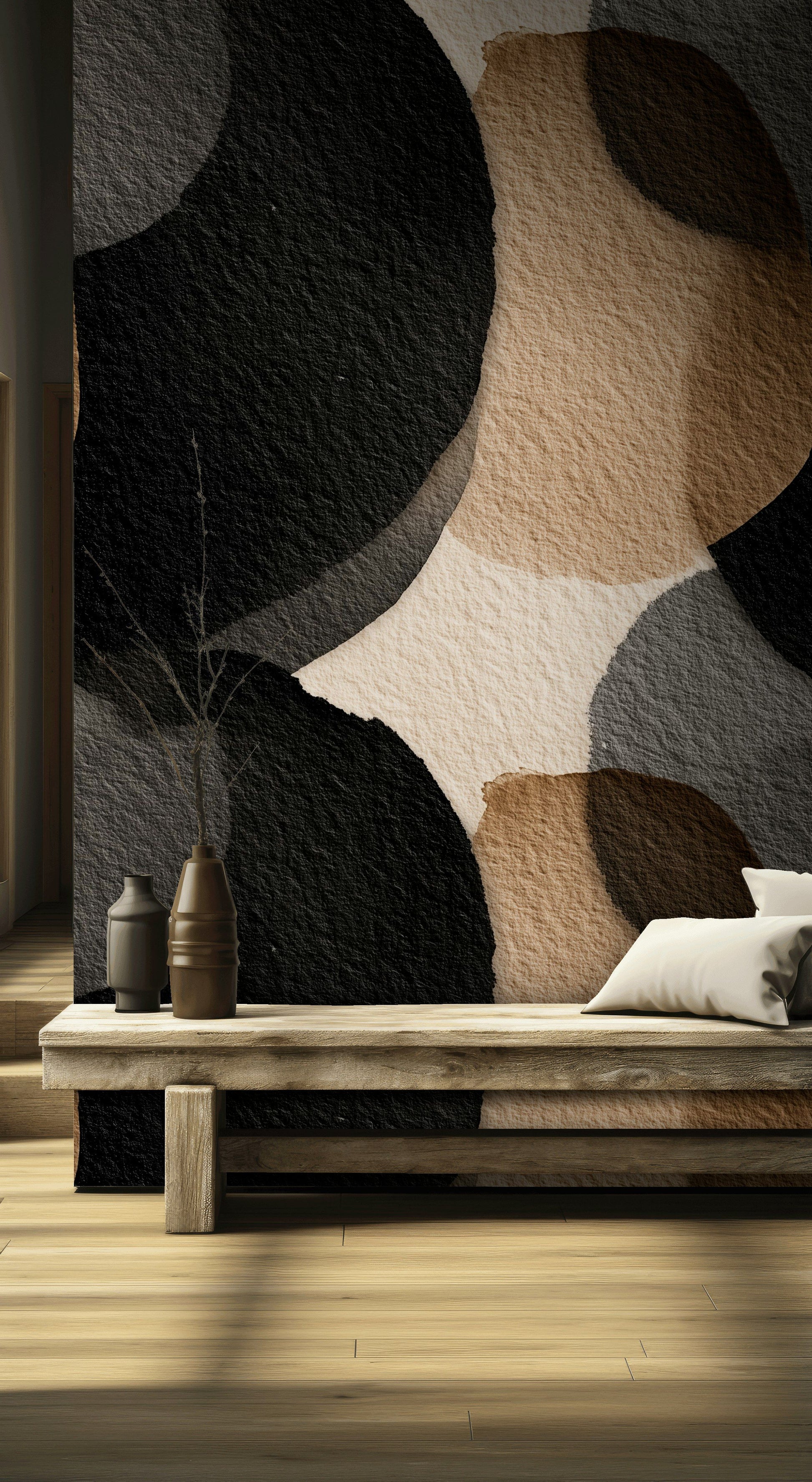 This modern removable wallpaper features abstract shapes in taupe, black, and stone gray, designed with a subtle watercolor effect and soft transitions. Neutral tones and organic lines make it a versatile option for accent walls, creative studios, or living spaces. Each double roll is peel and stick, combining minimal style with practical application. This design brings a contemporary, calming feel to any room.