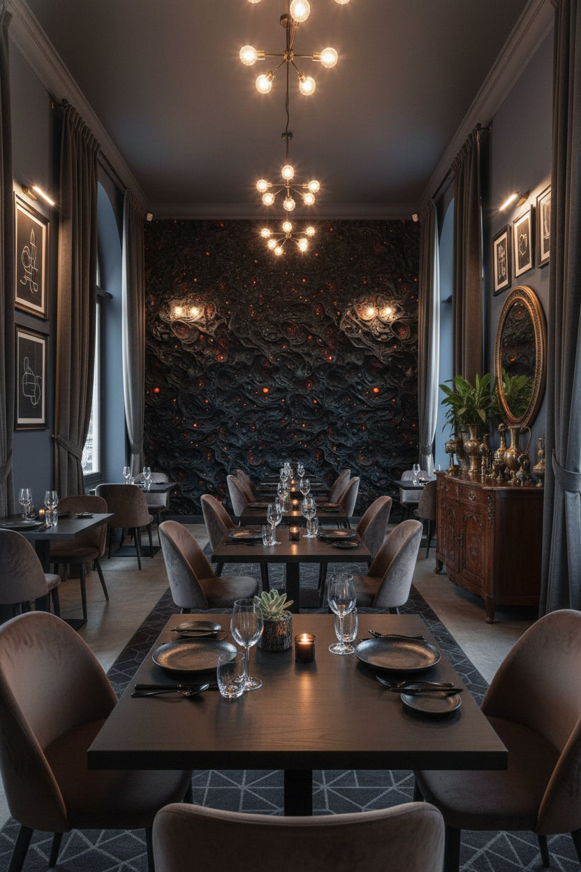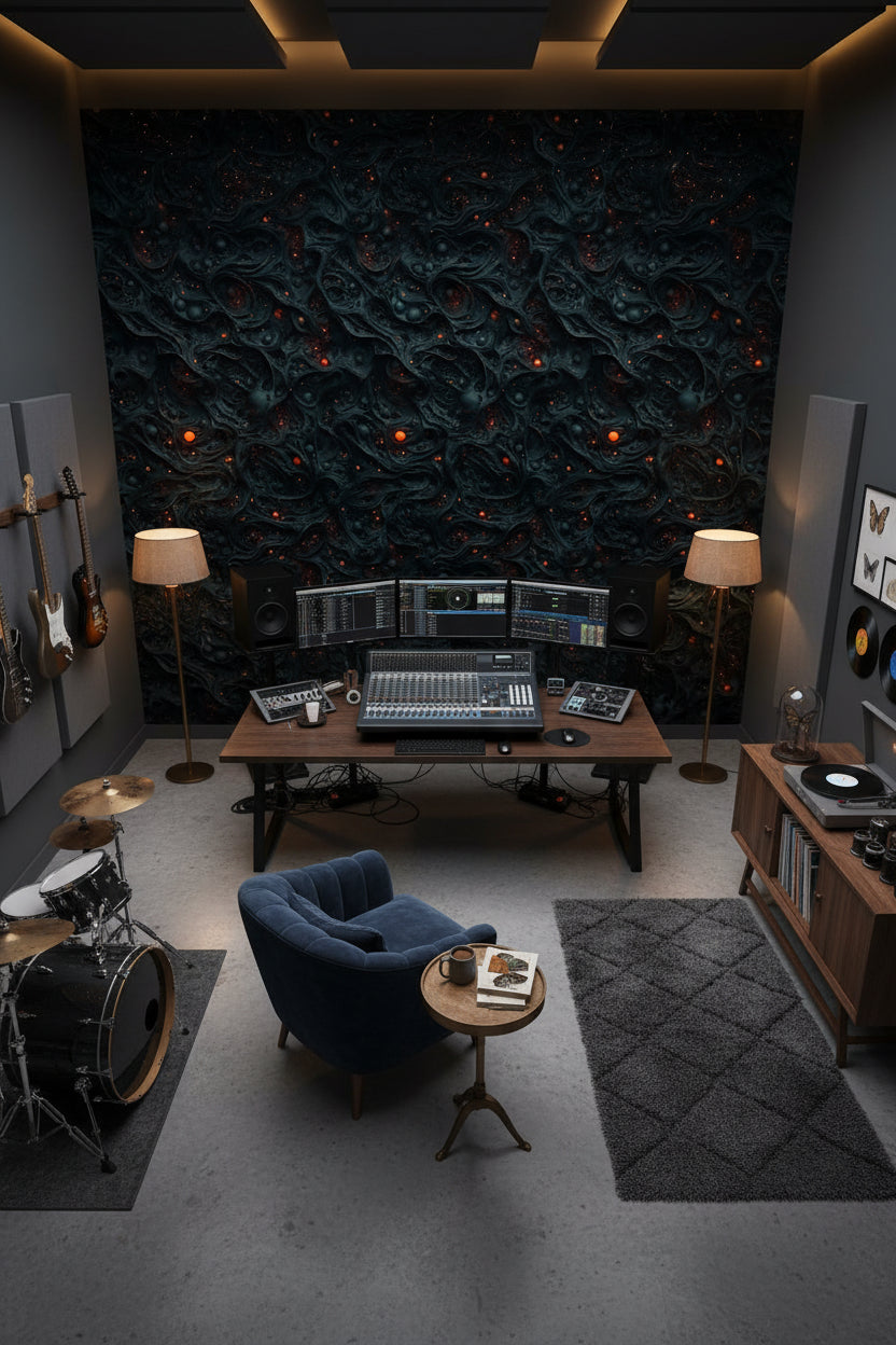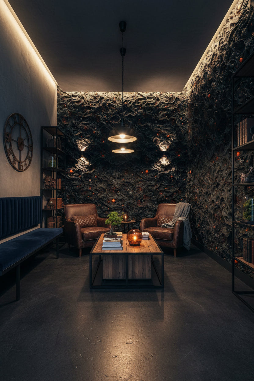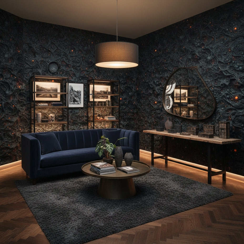 Soft, ambient lighting works best with the Textured Black Lava Abstract Wallpaper. The deep black tones absorb light, so using warm or dimmable lighting can create an intimate and luxurious atmosphere, enhancing the wallpaper's dramatic effect.