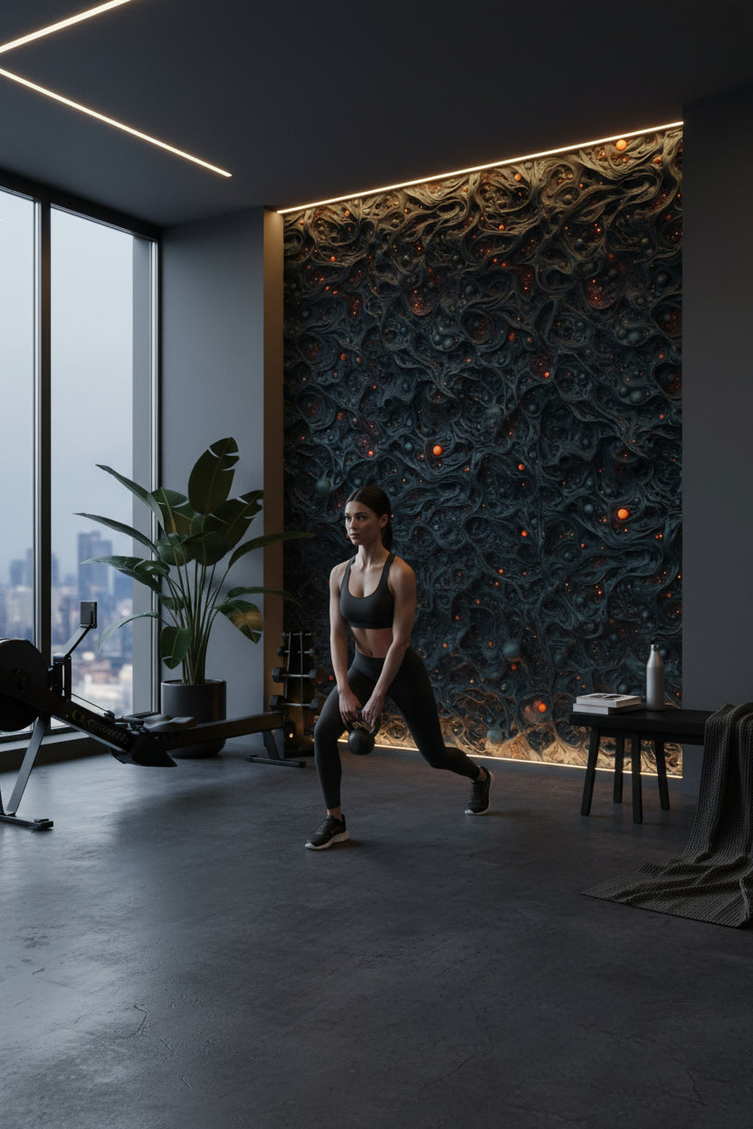 The abstract design of the Textured Black Lava Abstract Wallpaper adds depth and drama to modern living rooms. Its bold texture and dark tones complement luxurious furnishings, making it a centerpiece that elevates any contemporary interior.