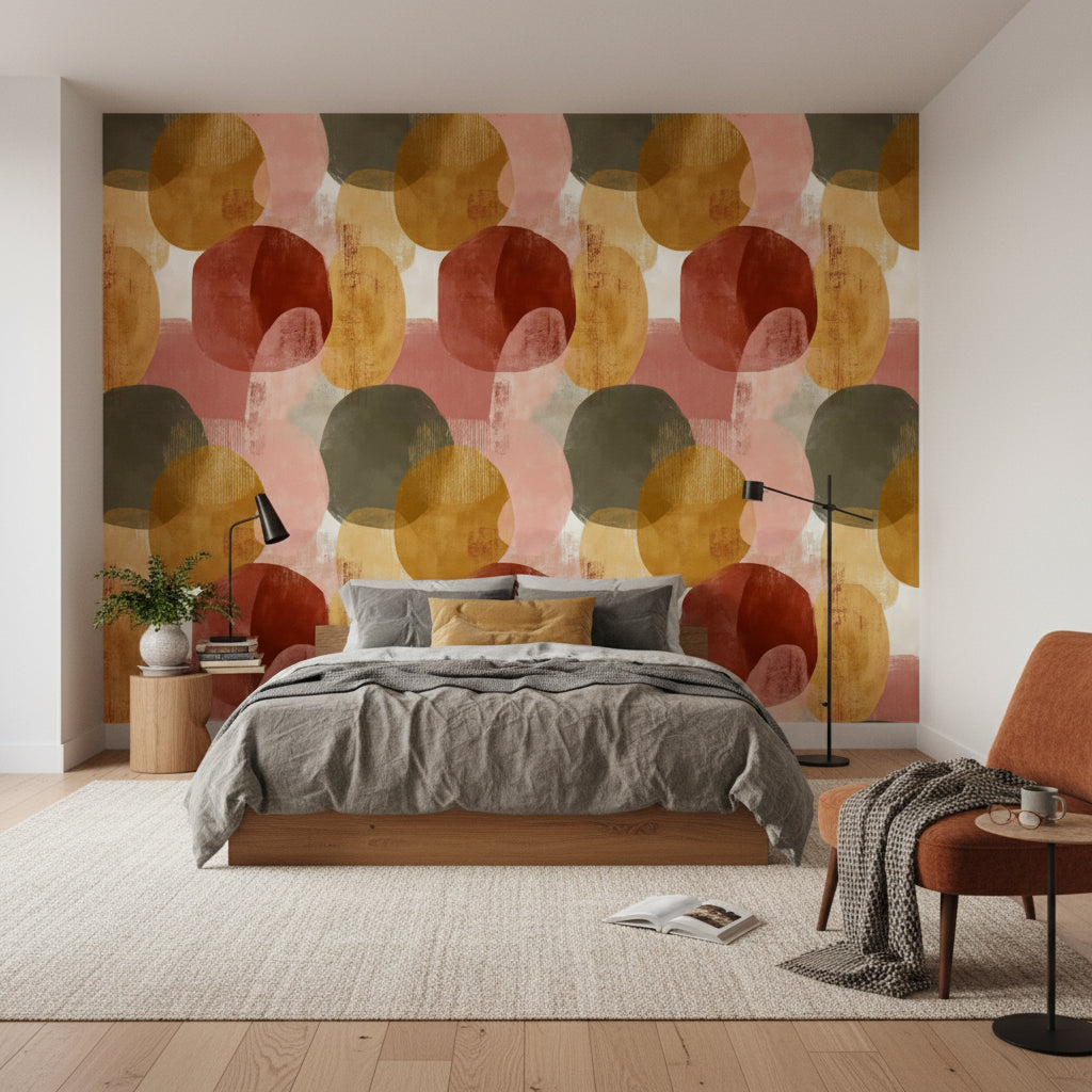 This abstract wallpaper includes geometric shapes in warm tones like pink, red, and yellow. The artistic design with painted texture gives a modern feel to any space.