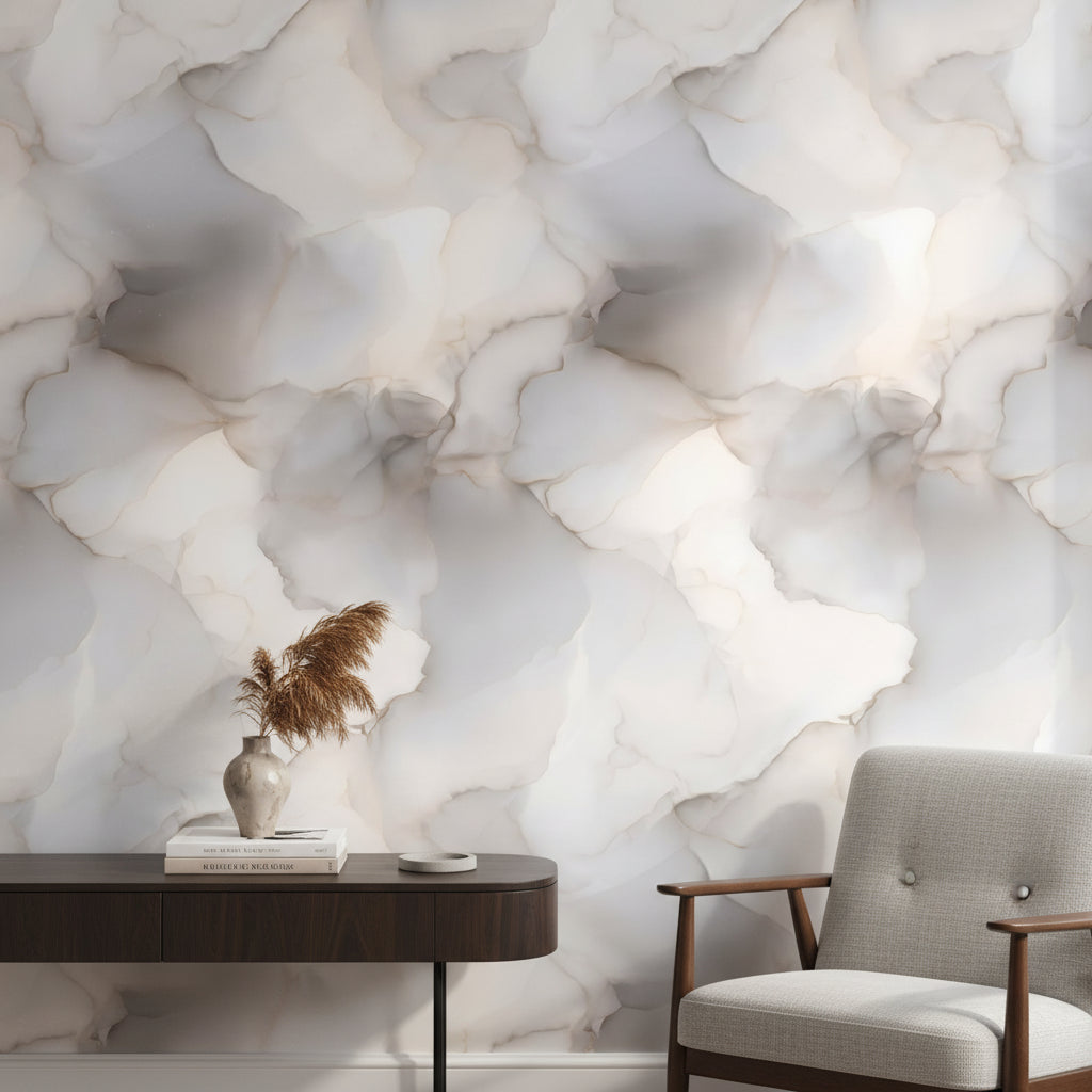 This elegant wallpaper features abstract shapes in white, light gray, and cream colors. The modern design includes a minimalist pattern that works beautifully in contemporary spaces.