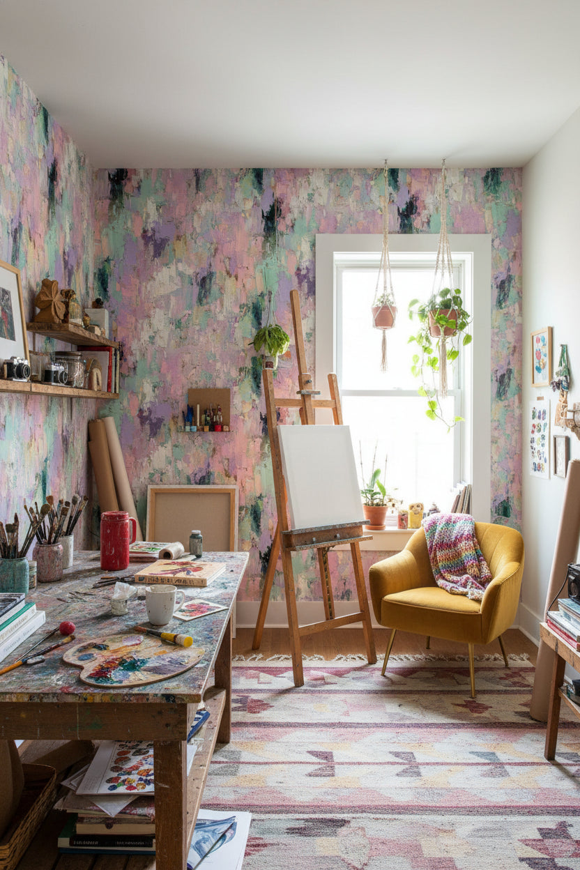 This abstract wallpaper features soft brush strokes in pastel hues of pink, mint green, and lavender. The textured design creates a calming mood with its gentle color transitions. Perfect for modern decor, this removable wall decor offers an artistic touch.