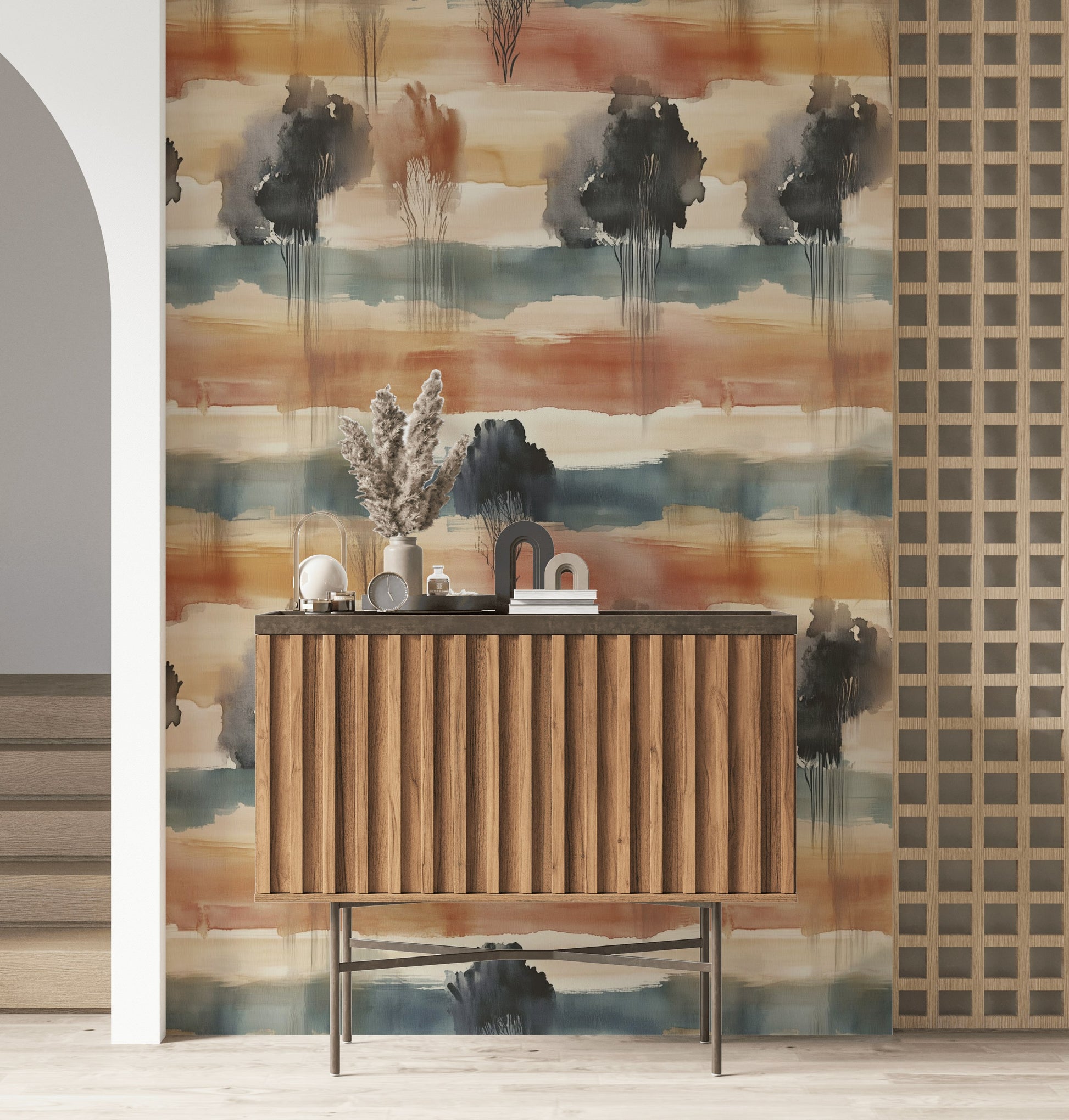 Add a serene artistic touch to your walls with this abstract watercolor landscape wallpaper. Featuring soft earth tones and gentle gradients with tree silhouettes, this design creates a peaceful and sophisticated ambiance. Perfect for living rooms, bedrooms, or creative spaces, its versatile style complements modern, rustic, or minimalist aesthetics. Choose from peel-and-stick or traditional paste for easy installation. Transform your home into a calming retreat with this unique wallpaper.