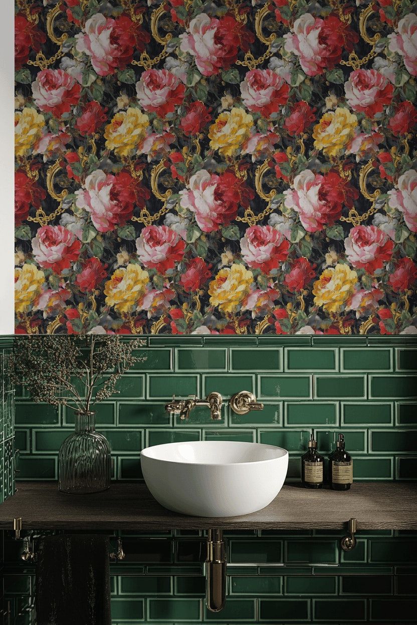 Pair this wallpaper with velvet upholstery, brass fixtures, and dark wood to enhance its luxurious feel. The rich reds, yellows, and pinks of the roses complement opulent decor elements, making it a striking addition to any sophisticated living space.