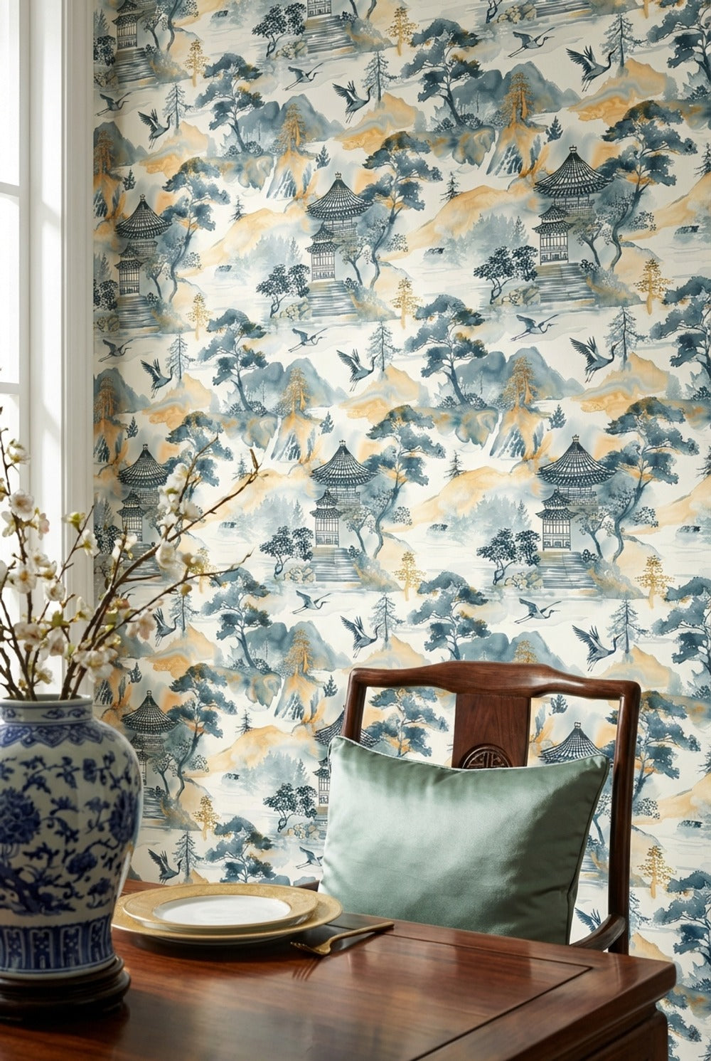 This mural shows a traditional Asian landscape with a serene pagoda, elegant cranes, and lush trees. The ink wash style and blue, orange, and white tones add a calming touch to any space.