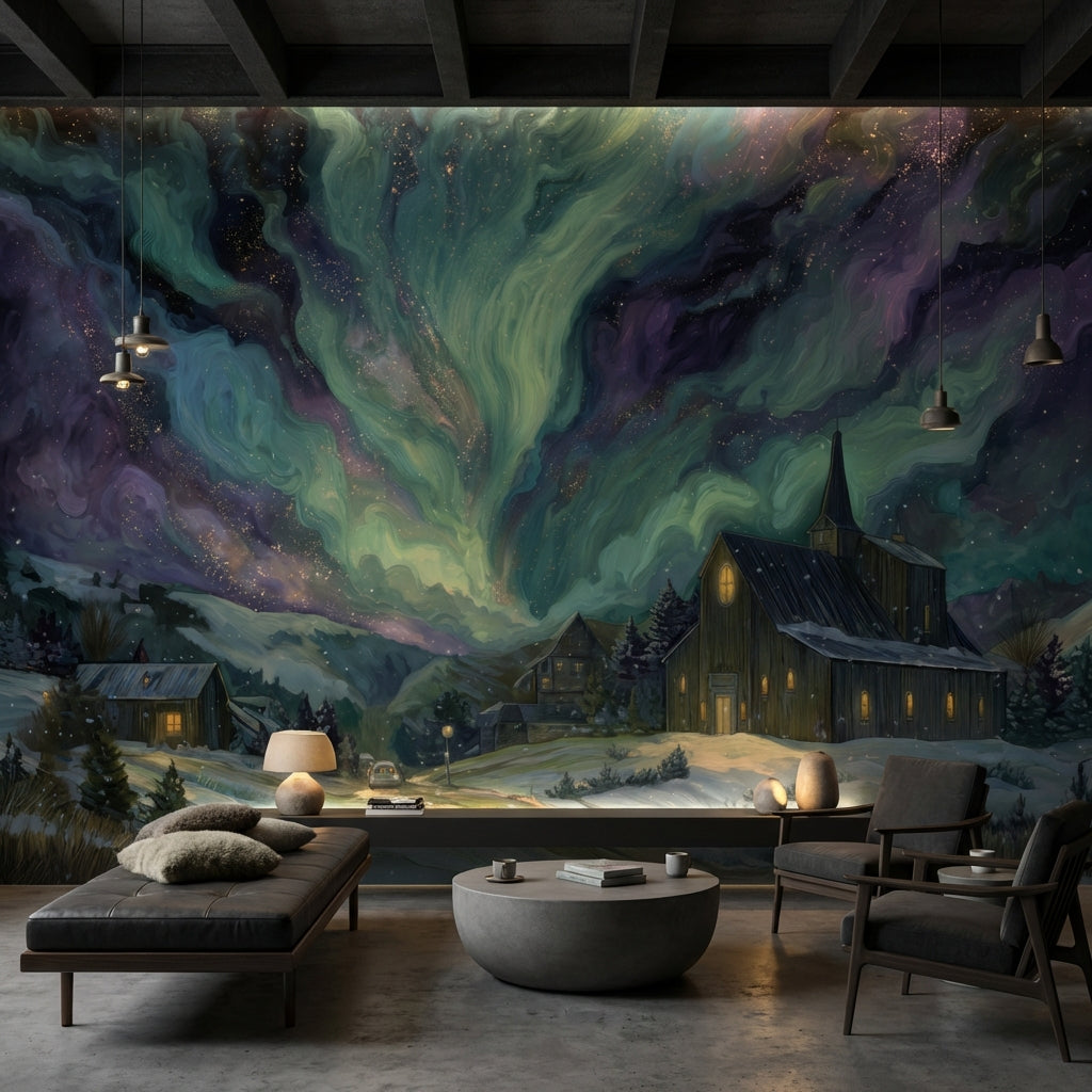This wallpaper shows a serene village winter scene under a vibrant aurora. The ethereal colors of green, purple, and blue create a peaceful atmosphere, perfect for a dramatic wall statement.