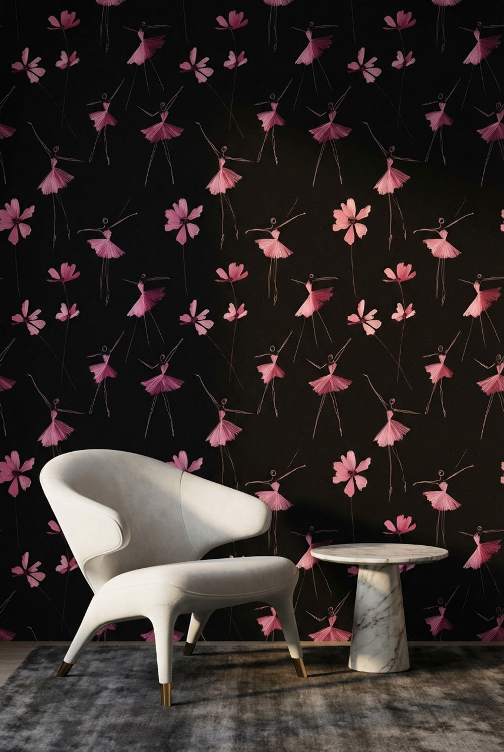 This artistic wallpaper shows elegant ballerinas and whimsical flowers set against a dark background. The pink and black color palette adds a modern touch to the abstract design.
