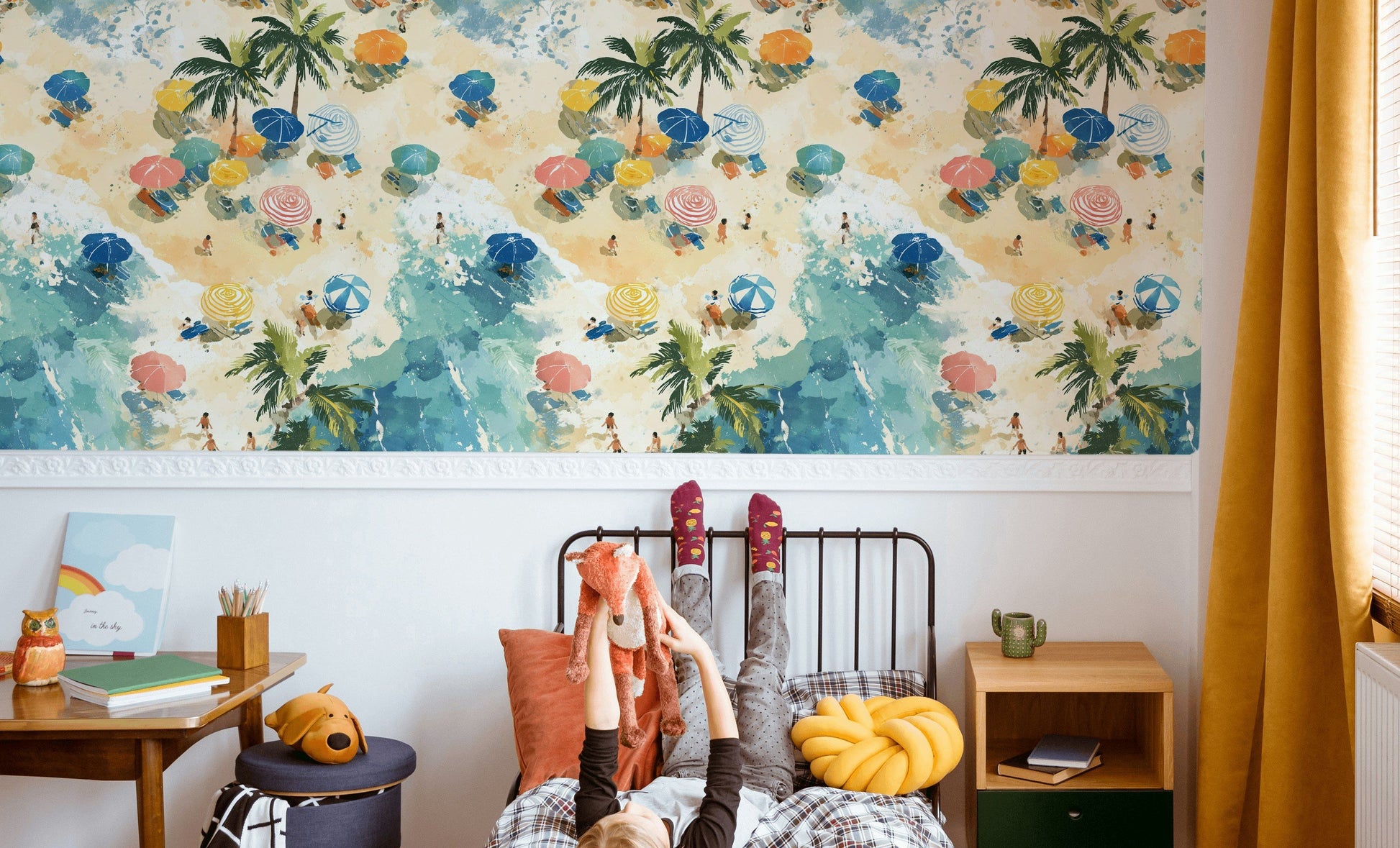 This removable wallpaper features beach umbrellas, palm trees, and playful swimmers painted in watercolor strokes of blue, yellow, and coral. The coastal design brings together tropical vacation themes with bright sun and ocean accents. Each peel and stick panel adds seaside style, perfect for creating a beach-inspired space in your home. The double roll covers walls with a vibrant, laid-back summer look.