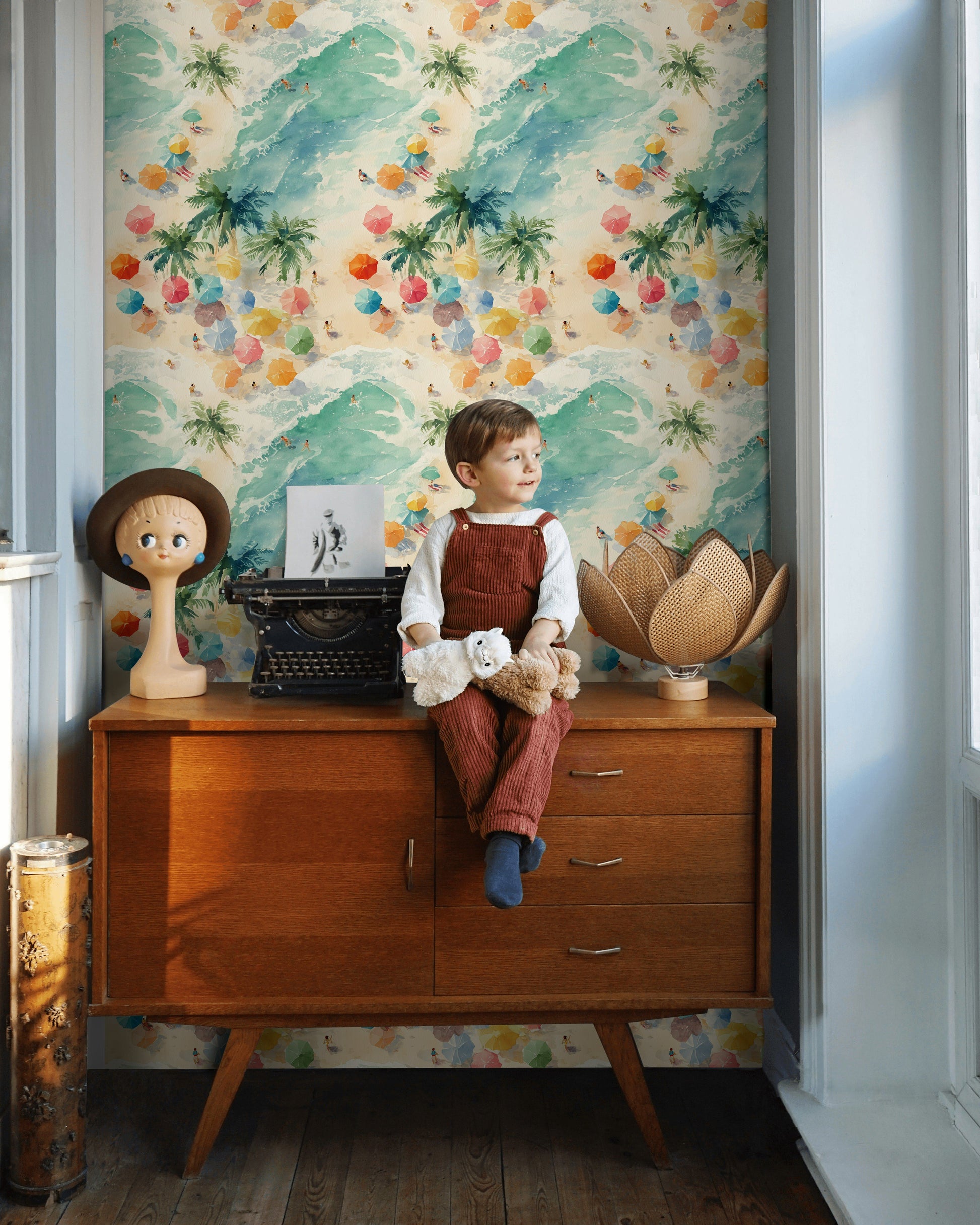 This peel and stick mural captures a watercolor beach scene filled with colorful umbrellas, palm trees, and turquoise waves rolling onto soft sand. The playful art style and pastel details bring a cheerful summer decor vibe to any space, while the removable material makes updating your wall simple. It’s designed to evoke the feeling of ocean days and coastal living, blending watercolor, beach wallpaper, and vibrant umbrella mural accents.