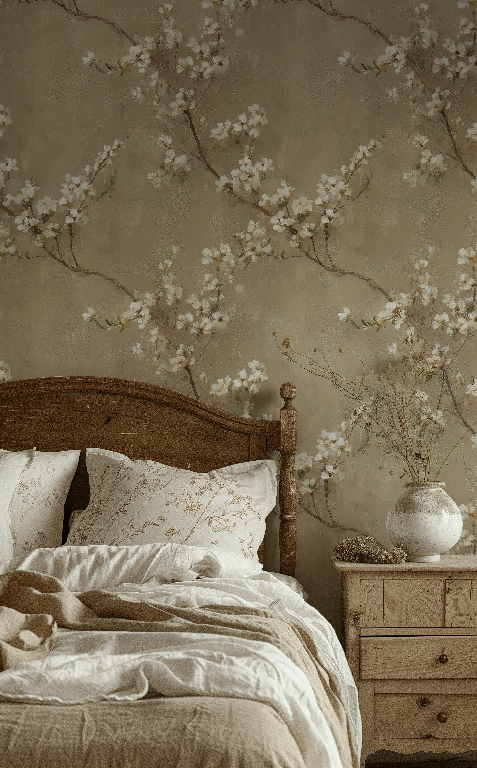 This wallpaper features white blossoms delicately painted across fine brown branches on a warm beige backdrop. Its soft brushstroke effect and neutral palette create a serene, natural aesthetic. Ideal for those seeking a minimal floral or neutral mural design, it complements both modern and traditional decor styles with its organic texture and understated tones.