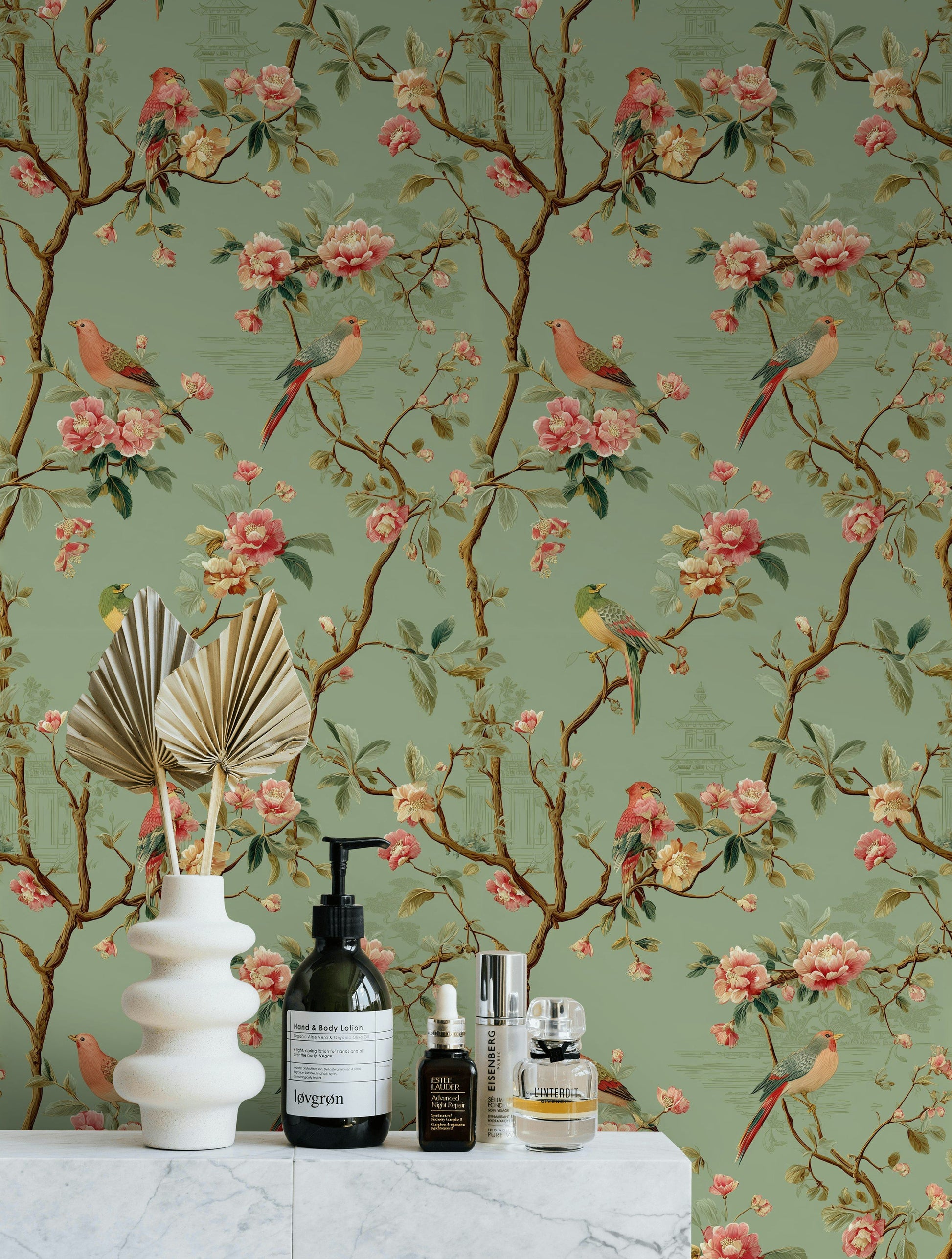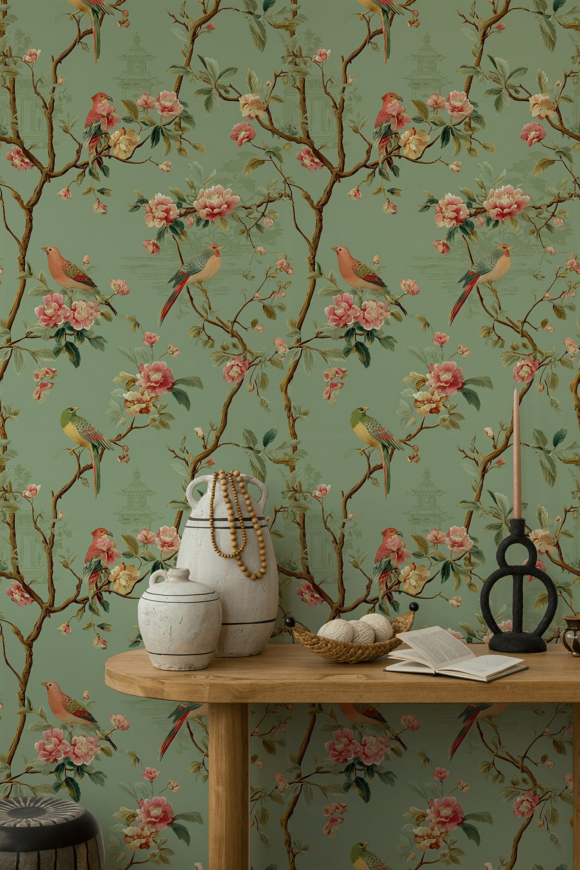 This peel and stick wallpaper features vintage-inspired bird art and floral mural designs on a soft sage green background. The detailed botanical wall pattern highlights flowering branches and natural decor with a classic floral feel. Designed as a removable wallpaper with wall double roll sizing, it suits traditional and vintage interiors. The muted tones and natural motifs bring a refined accent to any room seeking timeless style.