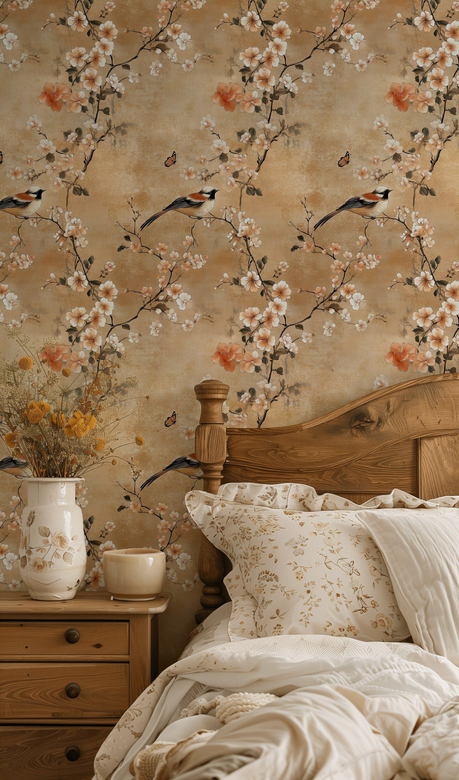 This bird wallpaper features painted blossoms in soft peach flowers and white cherry wall branches, paired with a perched bird and butterfly wall accents. The beige background gives it a vintage look, while the oriental decor influence adds an elegant botanical wallpaper character. Designed as a calm nature mural, it blends painted blossoms with floral branches for a serene natural effect. Suitable for adult and all ages spaces, it works beautifully as a blossom wallpaper centerpiece.