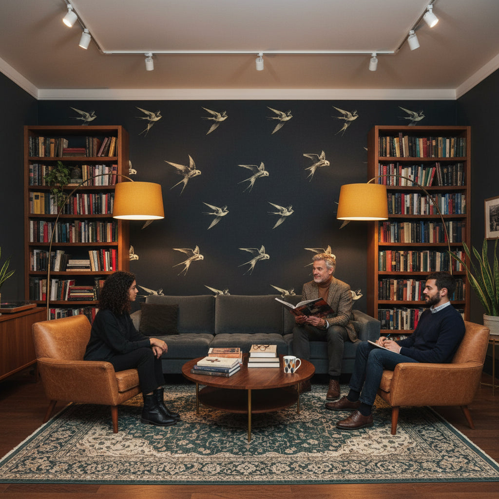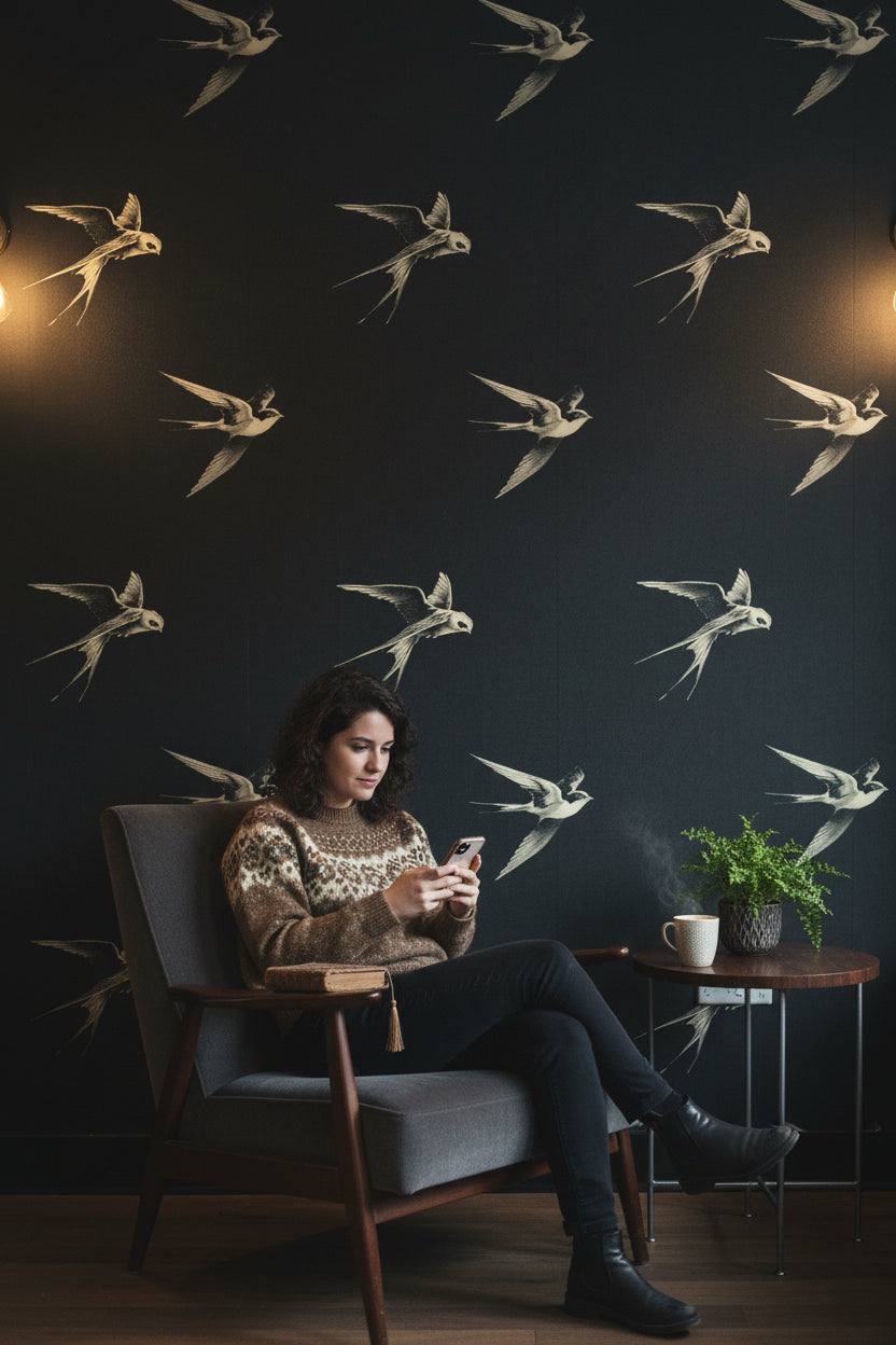 This elegant vintage wallpaper shows black and white birds in a classic style. The dark and sophisticated design works beautifully as a wall mural for any setting.