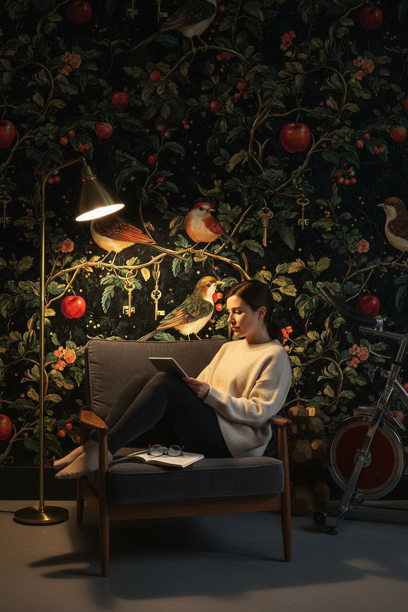 This wallpaper features unique elements like golden keys and apples interwoven with the botanical and bird motifs. These details add an unexpected twist to the design, making it a distinctive choice for accent walls.