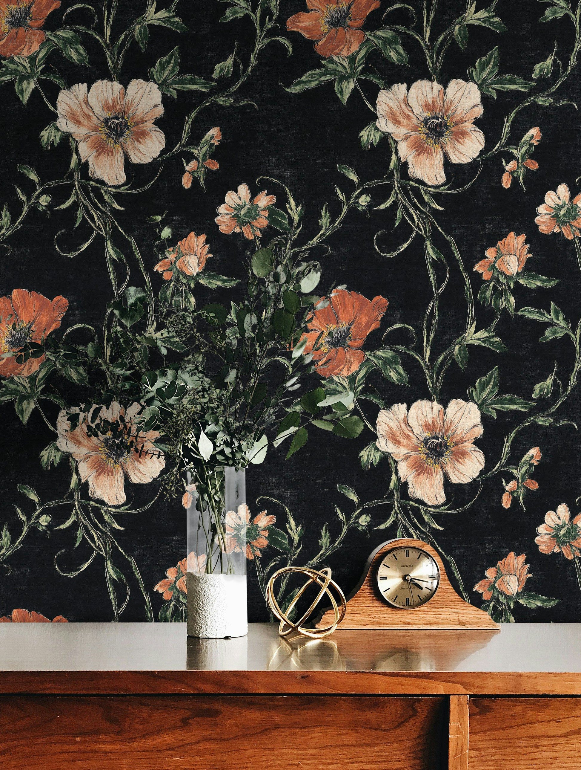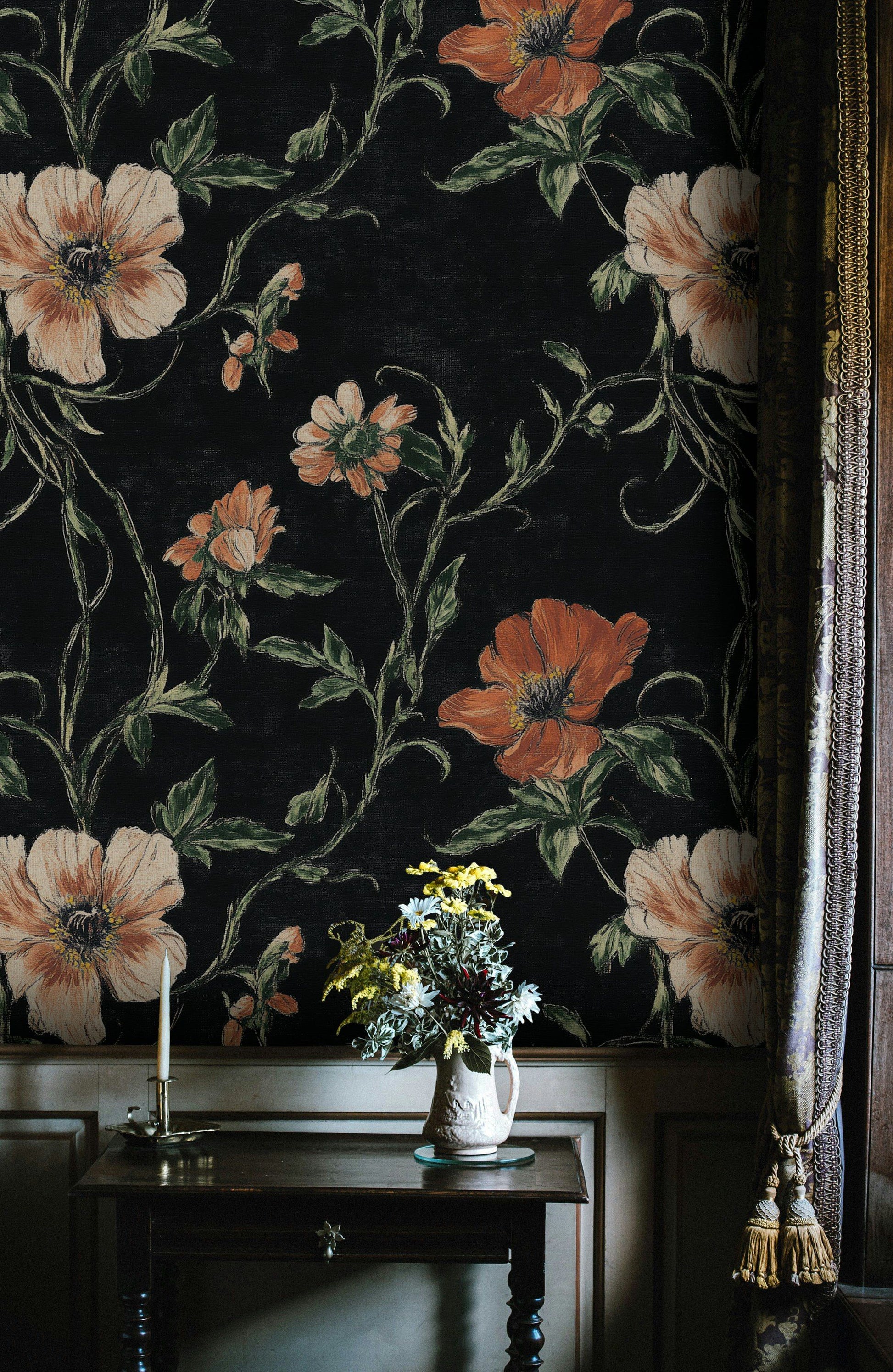 Black Floral Wallpaper Orange Blossom Wall Mural